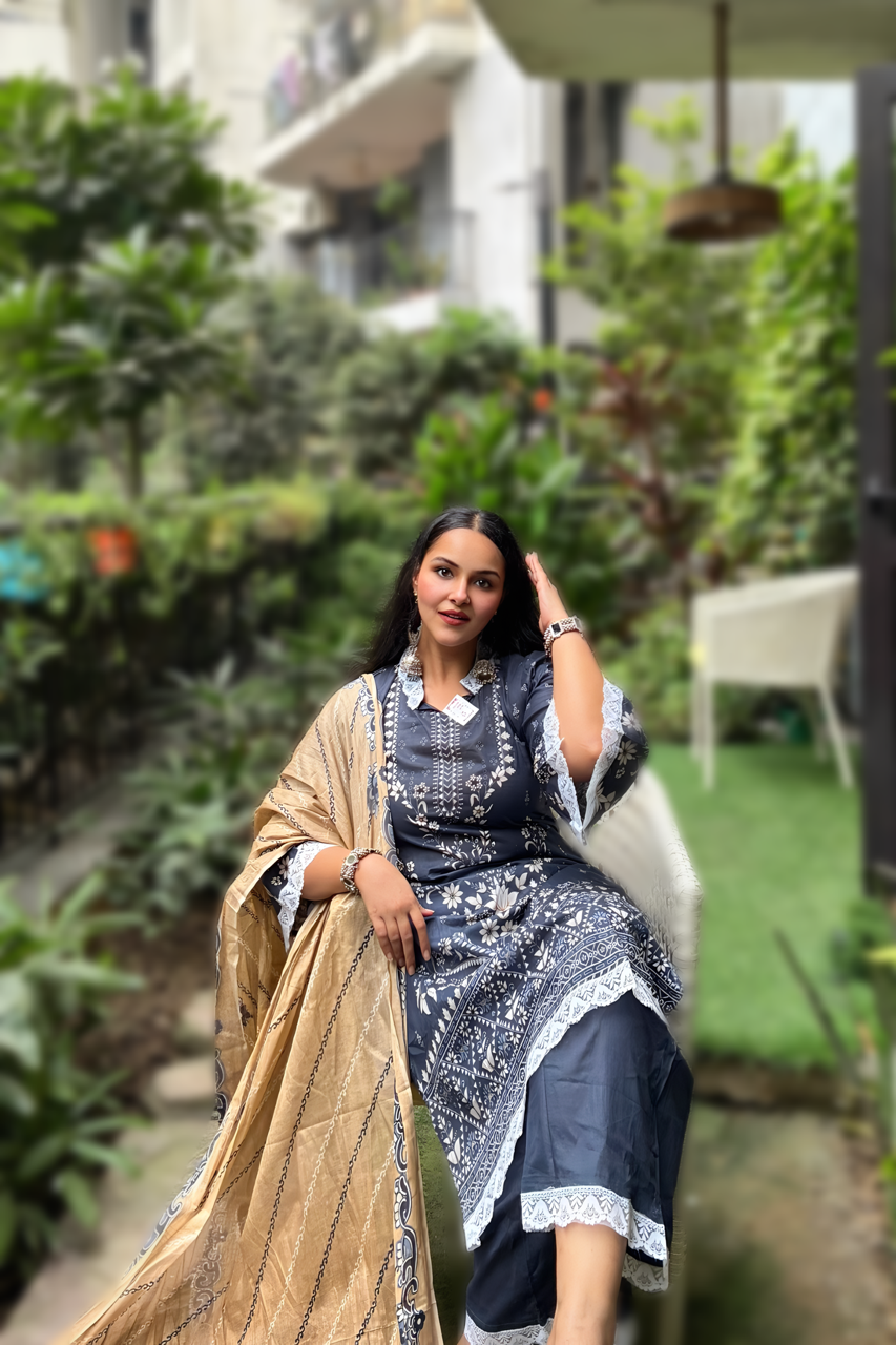 - Design Details: Below knee-length straight-fit kurta with full bell sleeves, scalloped lace accents, and delicate ivory florals on a navy base.