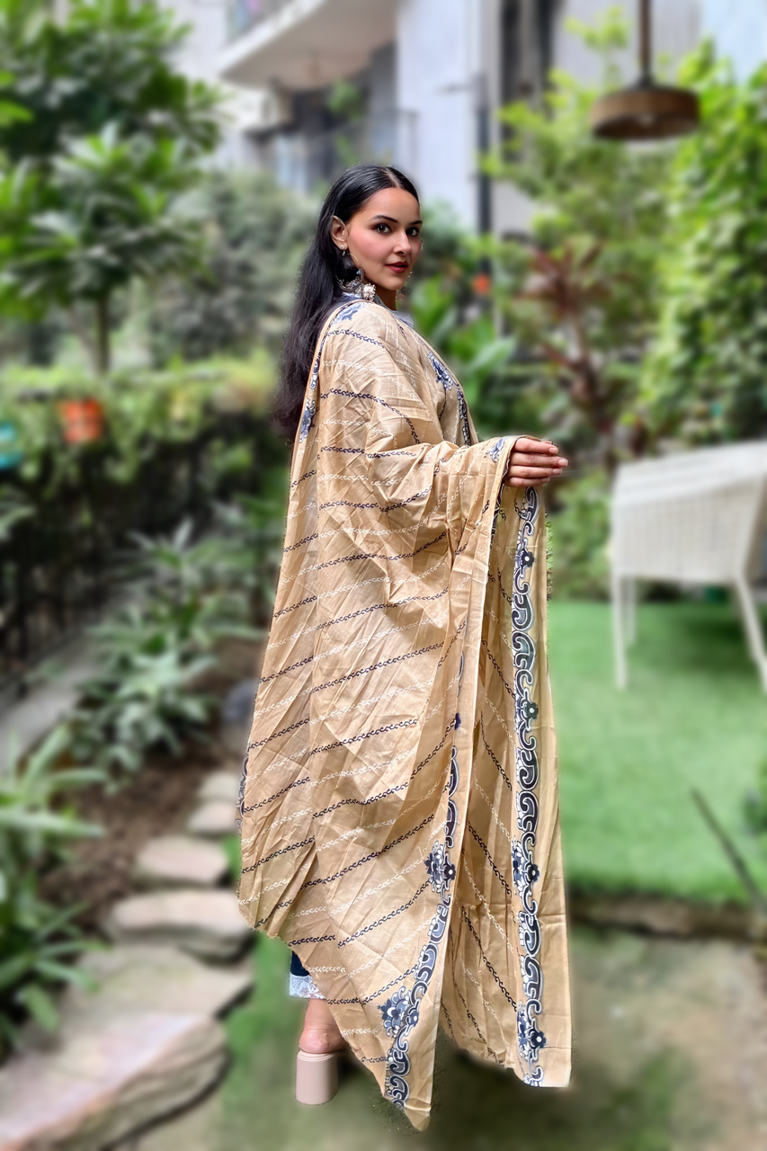 - Components: Three-piece Pakistani set including a digitally printed kurta, matching plazo-style pants with lace detailing, and a contrasting beige printed dupatta.