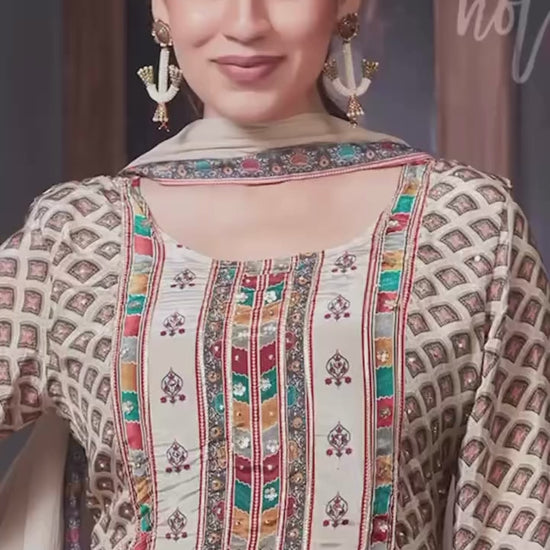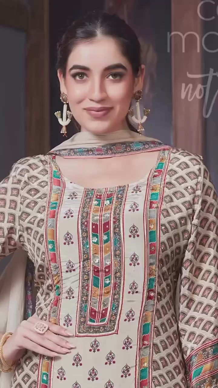 • Outfit Description: A coordinated three-piece suit set featuring a printed straight-cut kurta, matching palazzo pants, and a printed dupatta — blending ethnic detailing with effortless sophistication.