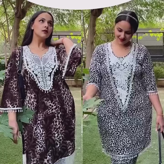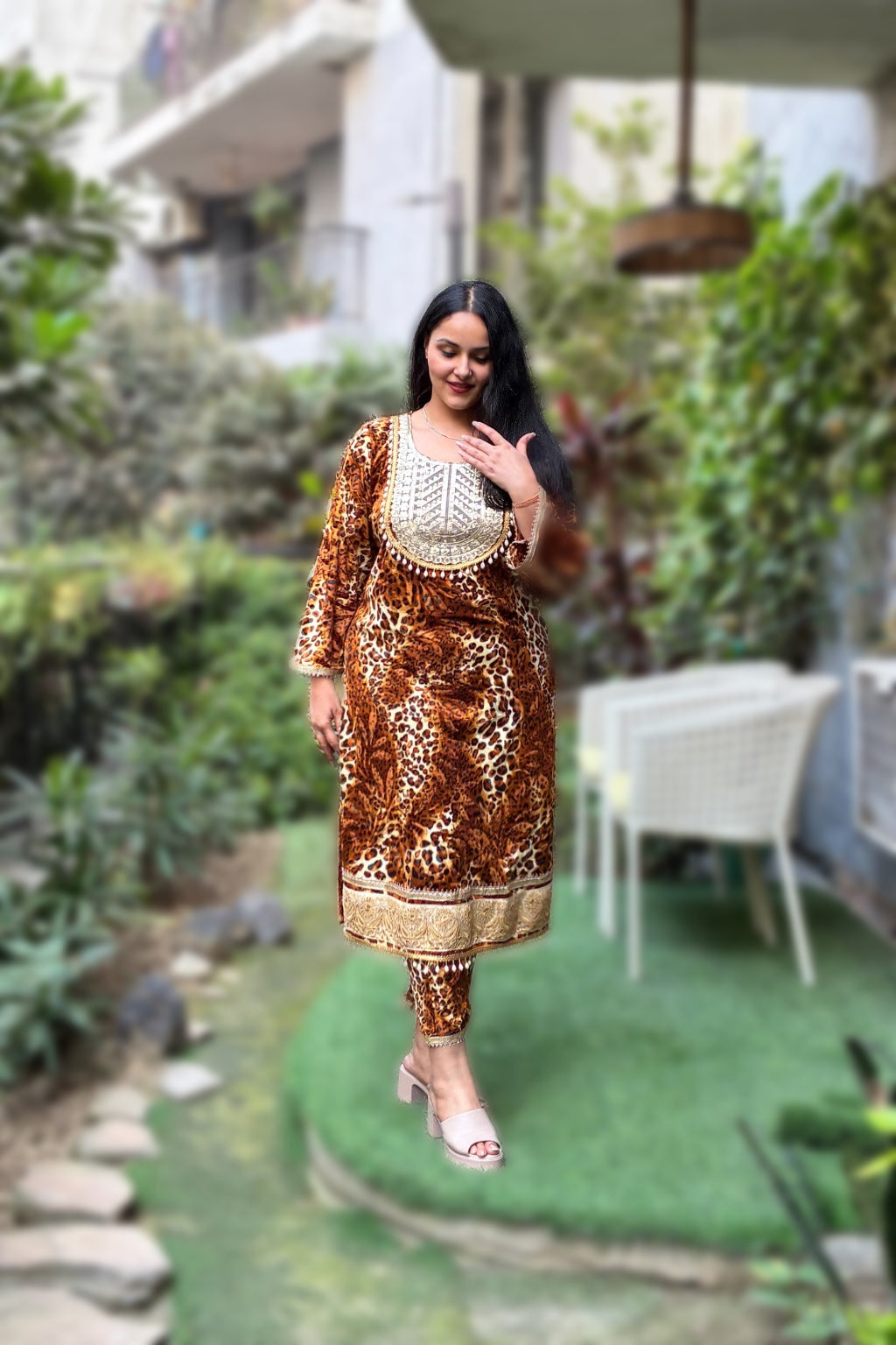 - Design Details: A straight-cut kurta in a deep golden leopard print, elevated with an intricately embellished circular neckline panel in shimmering gold threadwork. The soft round neck adds a graceful, feminine finish, while the sleeves and hemline are accented with matching gold borders for complete visual harmony. Paired with relaxed-fit velvet salwar pants featuring the same statement gold edging for a luxurious, coordinated silhouette.