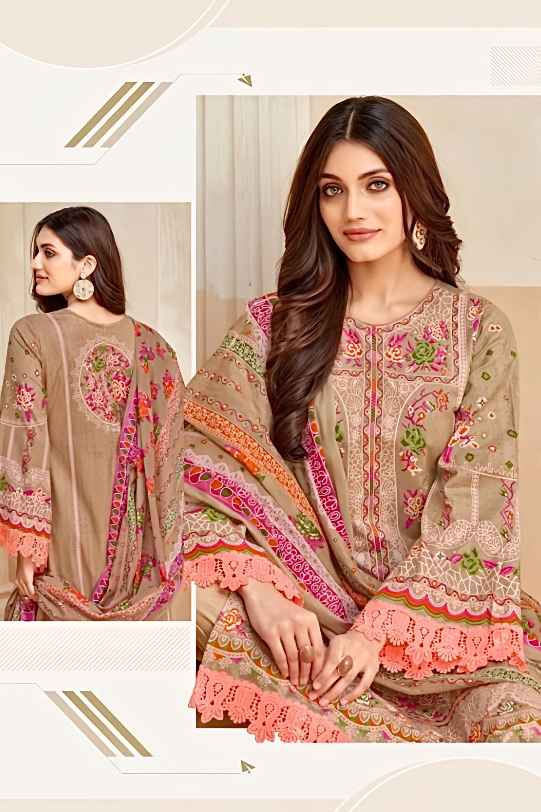 A soft sand-toned Pakistani suit set brought to life with delicate floral digital prints and vibrant peach lace detailing. The kurta features intricate panel-style motifs, paired with classic straight-fit pants and a beautifully printed dupatta that adds a fresh, festive glow.