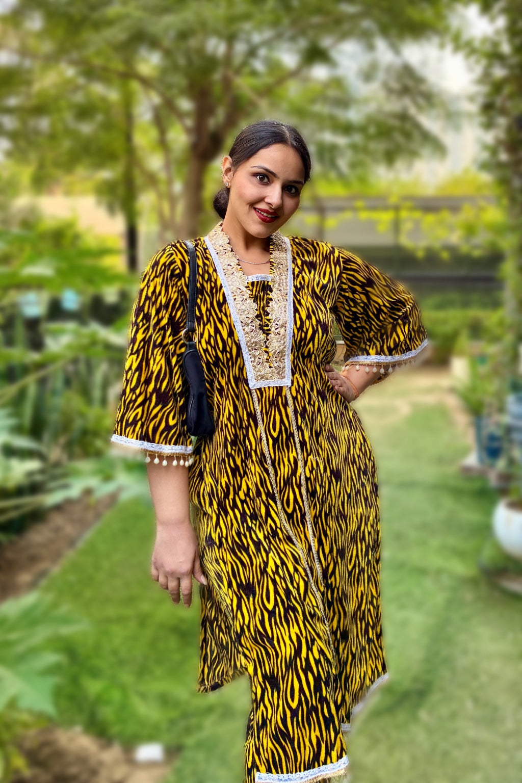 - Design Details: Vivid yellow-and-black tiger print enhanced with heavy golden threadwork and lace detailing. The neckline features elaborate embroidered panels with paisley motifs, floral detailing, scalloped edging and lace danglers. Matching embroidery with danglers on the bell sleeves and hem of the kurta balances the wild print with regal finesse.