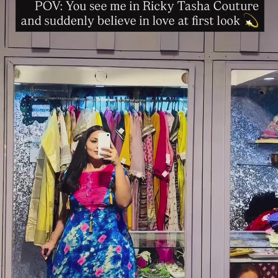 Step into regal charm with the Royal Amethyst Trail Gown from House of Ricky Tasha. The deep amethyst hues with splashes of pink create a contemporary ethnic vibe, while the plunging neckline and long flowing trail silhouette add dramatic flair. A fusion masterpiece, it blends Indian artistry with global runway appeal.