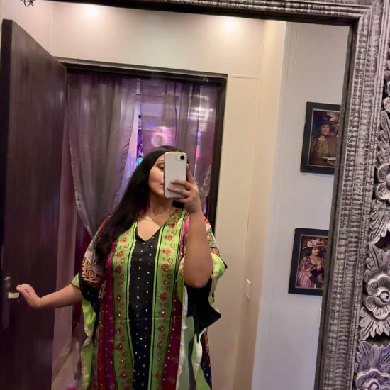 A statement-making multicolor crepe kaftan that blends traditional charm with contemporary comfort. Adorned with delicate mirror work and gold thread detailing, this flowy silhouette offers effortless elegance for festive gatherings, brunches, or evening soirees. The luxe crepe fabric drapes beautifully, while the vibrant stripes add a touch of artistic flair.