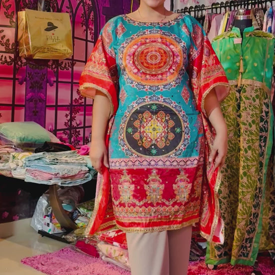 Immerse yourself in the vibrant allure of the Zarina Bohemian Radiance Kaftan, a celebration of color, culture, and comfort. Crafted from luxe crepe, it features intricate mandala-inspired motifs in jewel tones of turquoise, coral, and gold. The ornate border detailing, mirror work and soft flowy silhouette bring together ethnic artistry and contemporary charm — a statement piece that turns every glance into admiration.