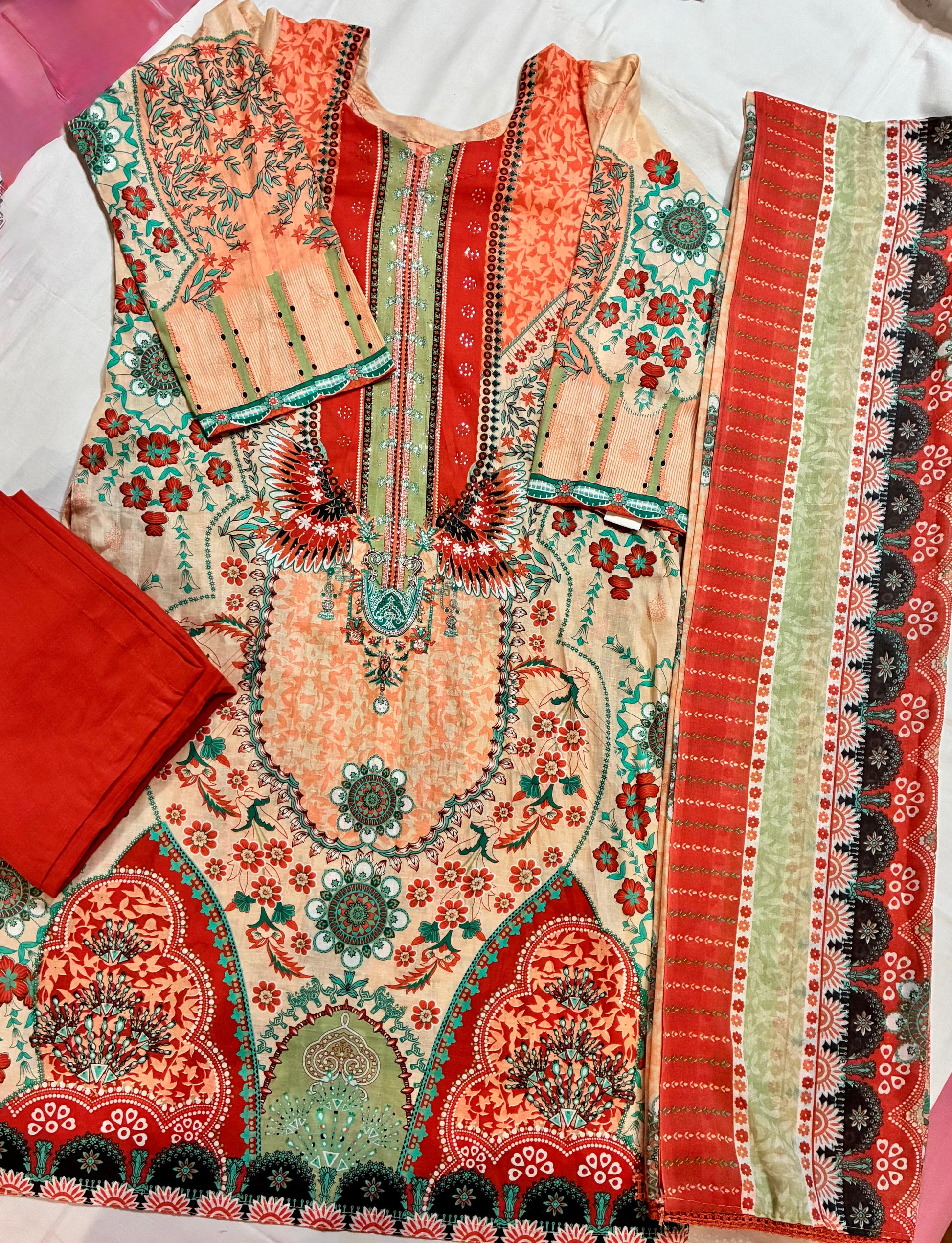 - Components: A coordinated three-piece Pakistani set featuring a printed kurta, relaxed plazo-style pants, and a beautifully balanced digital print dupatta that completes the look.