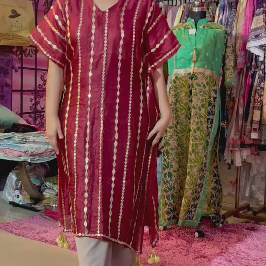 The Zarmina Gold Foil Sequence Striped Organza Kaftan exudes timeless festive elegance with a contemporary edge. Crafted from luxe organza fabric, it features striking gold foil stripes on both the front and back, creating a radiant play of shimmer with every movement. The metallic lines elongate the silhouette, while subtle sequin detailing and tassel accents at the hem lend a refined festive charm. Lightweight yet regal, this kurta is perfect for celebratory evenings, intimate gatherings, and festive brunches.